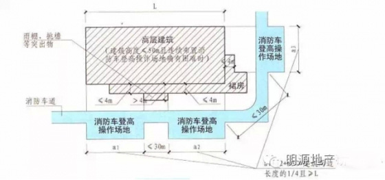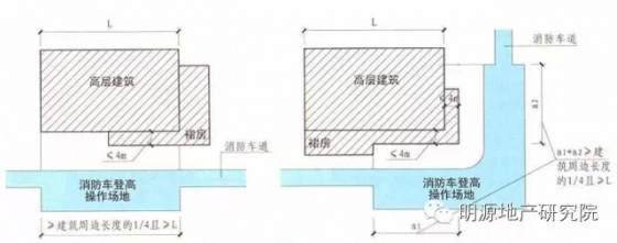 1)高層建筑應(yīng)至少沿一個長邊或周邊長度的l/4且不小于一個長邊長度的底邊連續(xù)布置消防車登高操作場地,該范圍內(nèi)的裙房進深不應(yīng)大于4米;