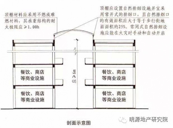 5.步行街兩側(cè)建筑的商鋪,其面向步行街一側(cè)的圍護構(gòu)件的耐火極限不應(yīng)低于1小時。相鄰商鋪之間面向步行街一側(cè)應(yīng)設(shè)置寬度不小于1米、耐火極限不低于1小時的實體墻;當(dāng)步行街兩側(cè)的建筑為多個樓層時,每層面向步行街一側(cè)的商鋪均應(yīng)設(shè)置防止火災(zāi)豎向蔓延的措施;