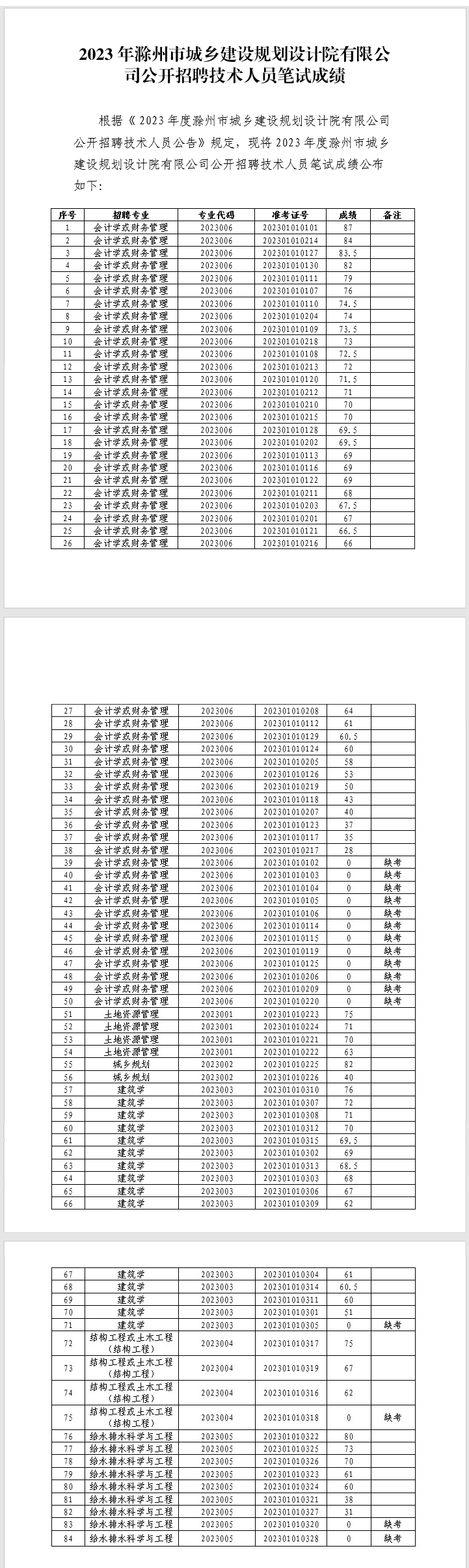 2023年滁州市城鄉(xiāng)建設(shè)規(guī)劃設(shè)計(jì)院有限公司公開招聘技術(shù)人員筆試成績(jī)