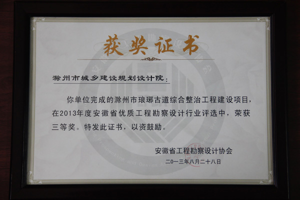 安徽省工程勘察設(shè)計(jì)協(xié)會于2013年8月3日組織專家召開安徽省優(yōu)秀工程勘察設(shè)計(jì)行業(yè)獎評審會,對全省共62家單位上報(bào)的320個項(xiàng)目進(jìn)行了為期兩天的評選。由我院市完成的滁州市瑯琊古道綜合整治工程建設(shè)項(xiàng)目在2013年度安徽省優(yōu)秀勘察設(shè)計(jì)行業(yè)評選中,榮獲三等獎。
