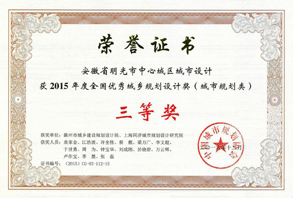 明光市中心城區(qū)規(guī)劃獲獎證書