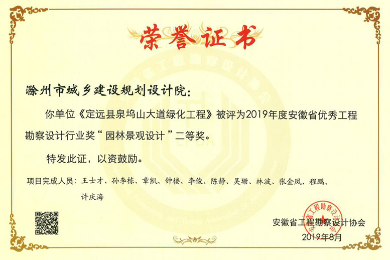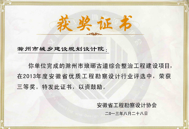 滁州市瑯琊古道綜合整治工程獲獎證書.