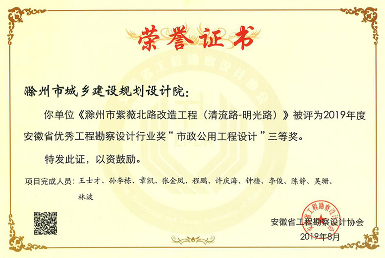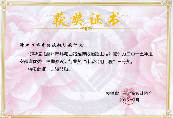 滁州市環(huán)城西路延伸段道路工程獲獎證