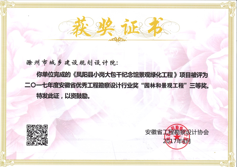鳳陽縣小崗大包干紀(jì)念館景觀綠化工程獲獎證書